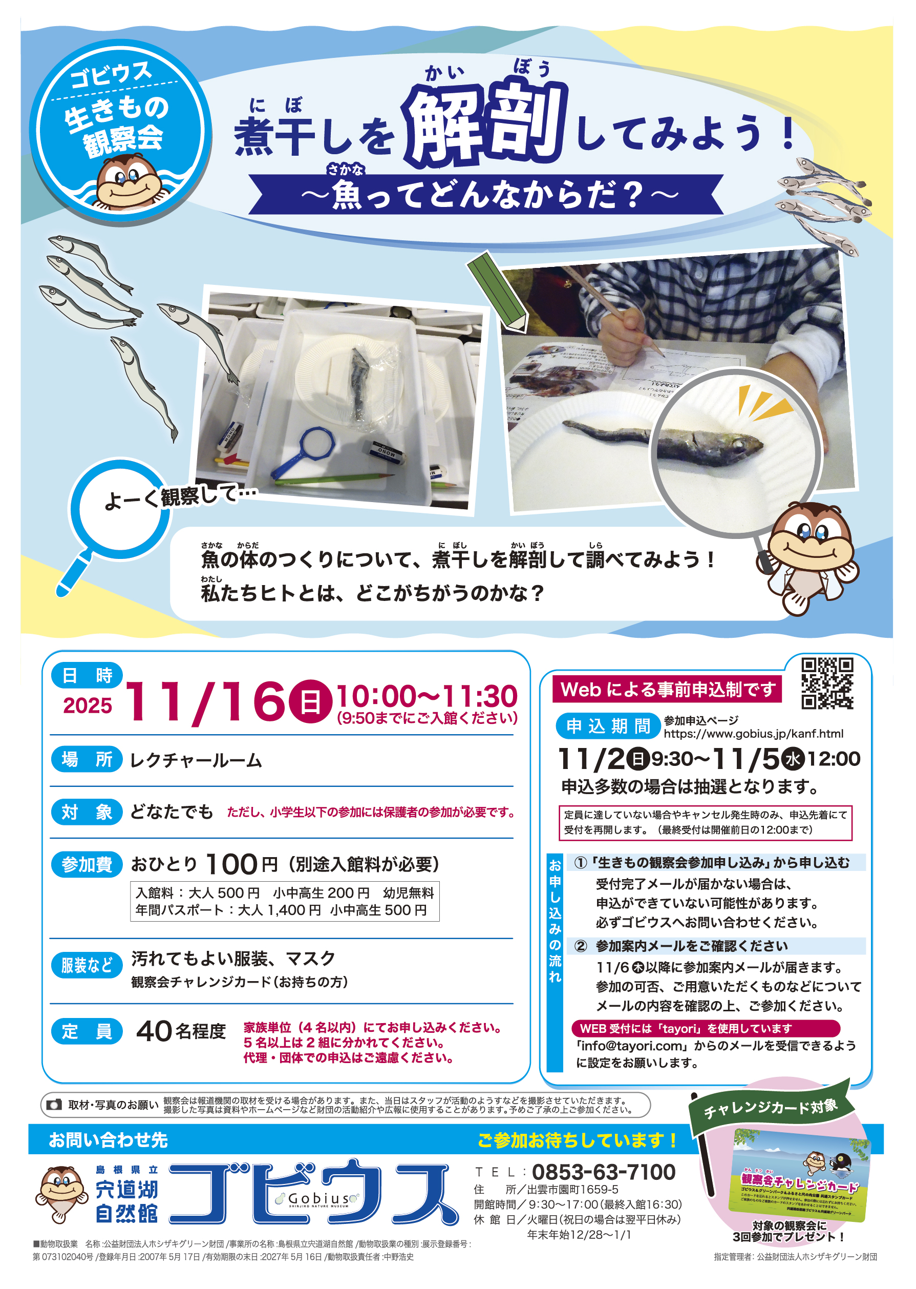 2025年10/1(水)〜好評につき10/31(金) 火曜日は休館日です。 ※ナイトゴビウス開催時間(10/18・10/25の18:00〜20:30)は中止します。 |