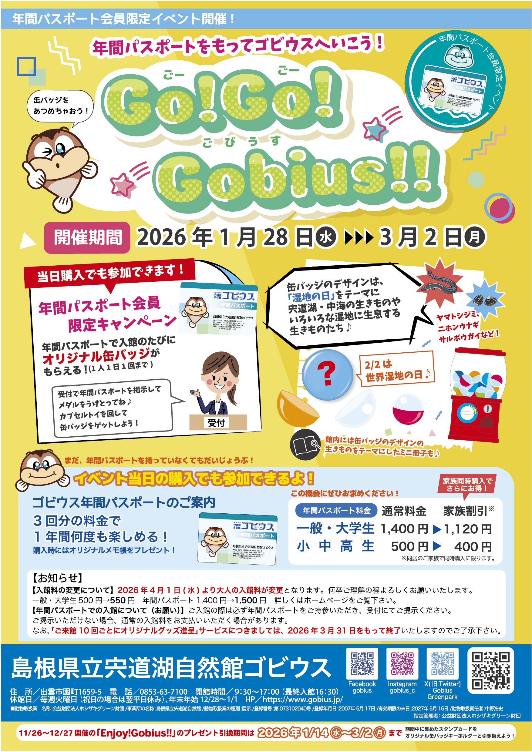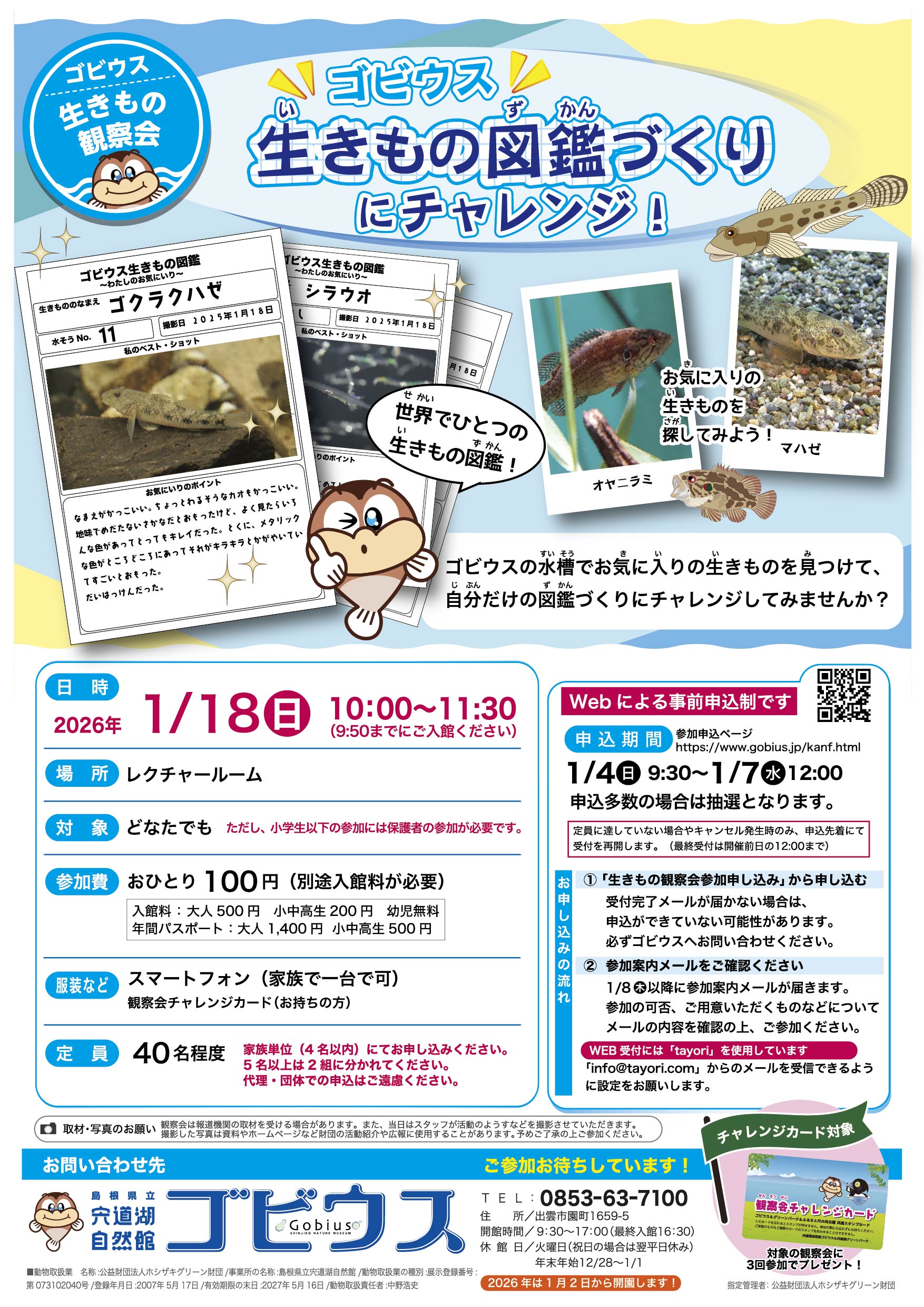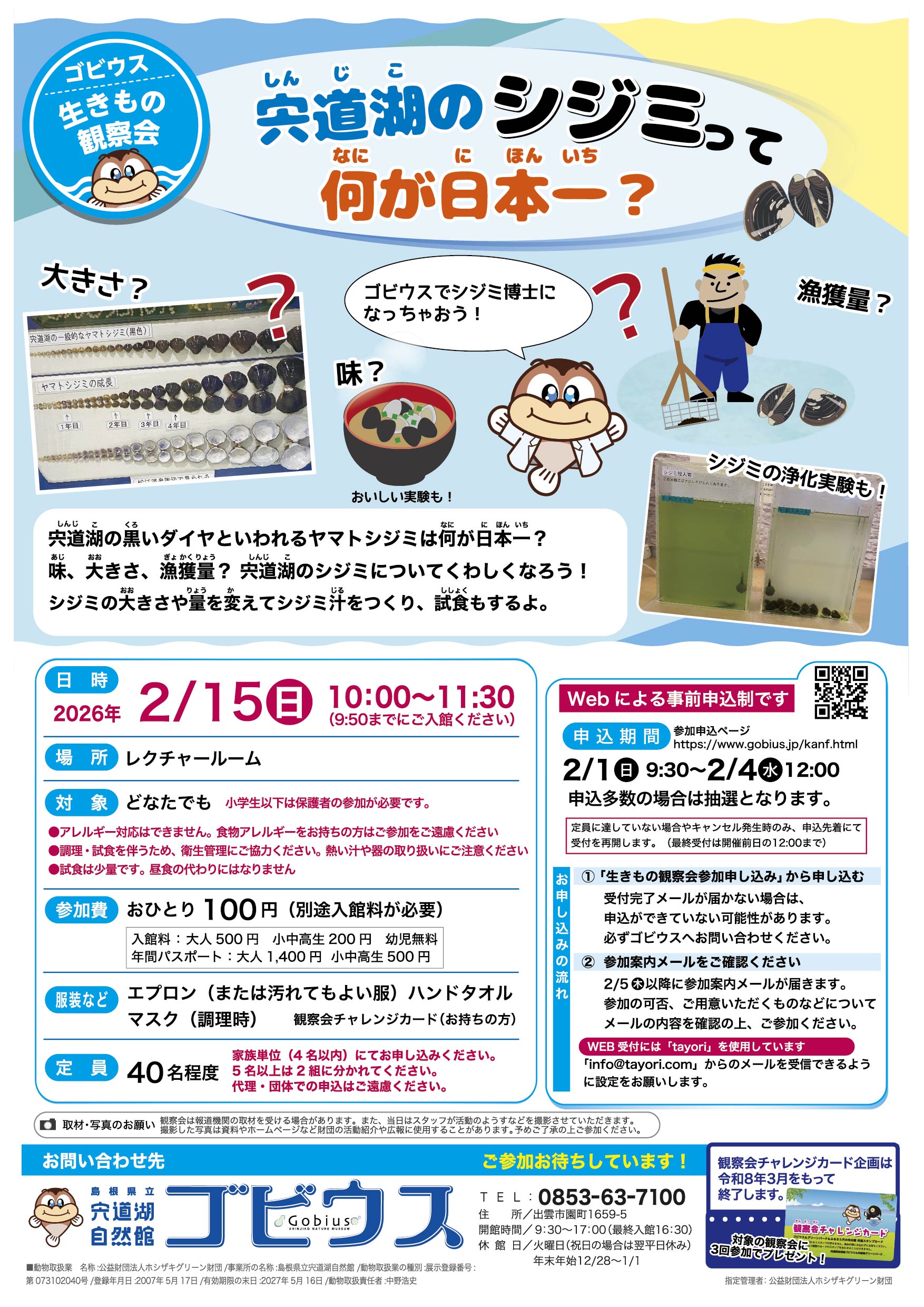 | お問い合わせ | キャンセル等の連絡は電話にてご連絡ください。 宍道湖自然館ゴビウスTEL:0853-63-7100 ※電話は開館時間内(9:30-17:00)におかけください。火曜(祝日の場合は翌平日)は休館です。 |