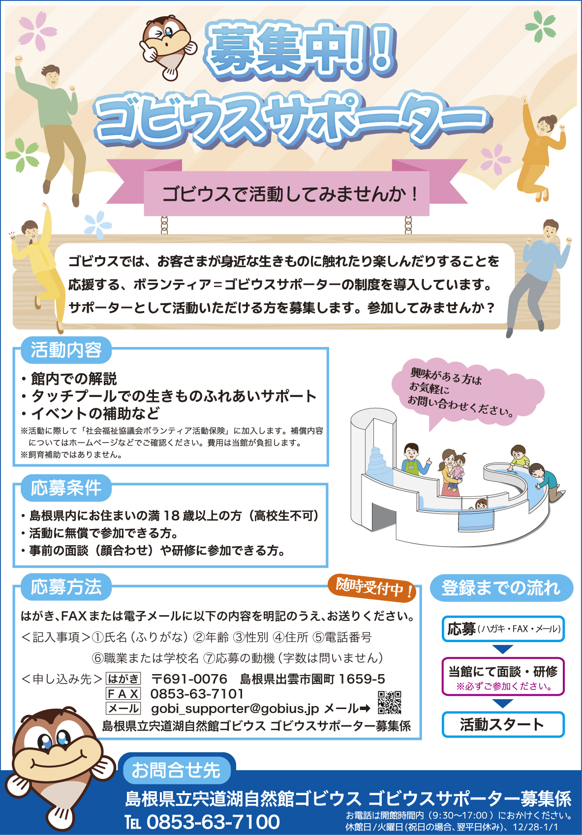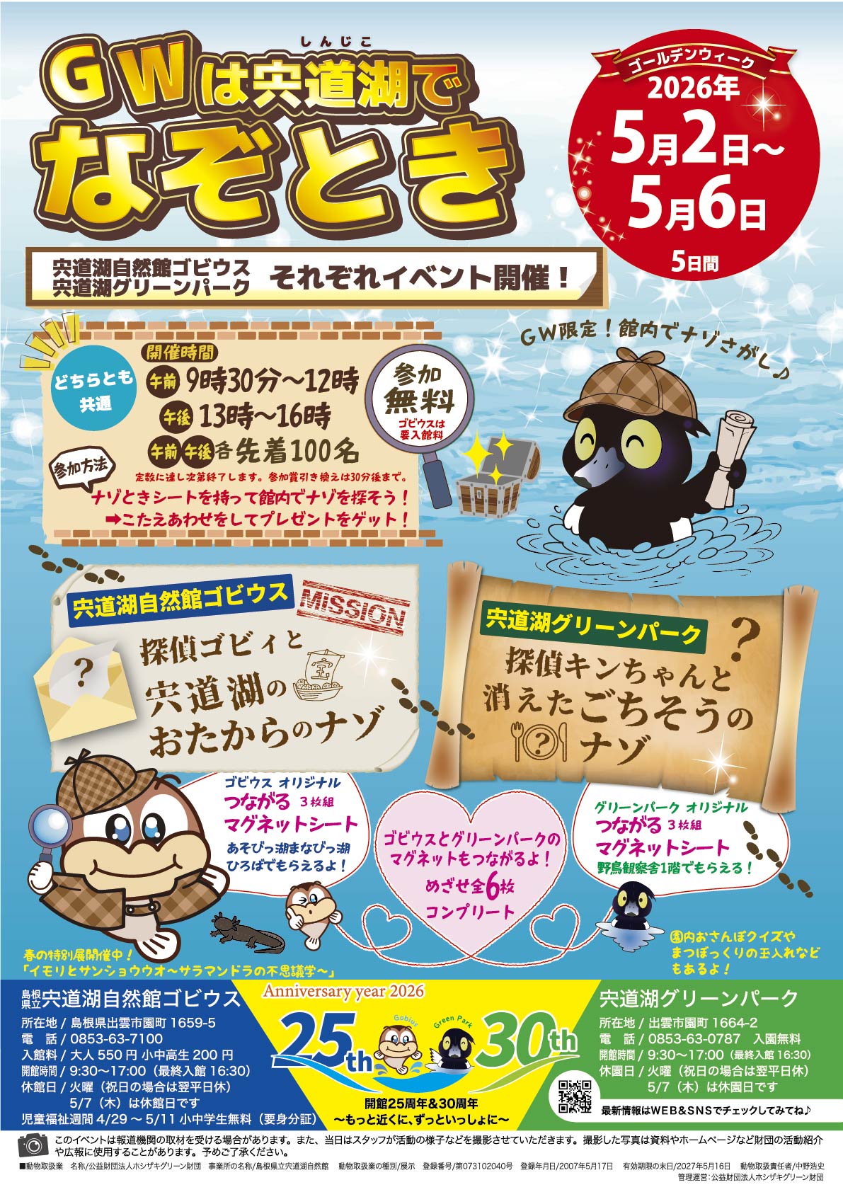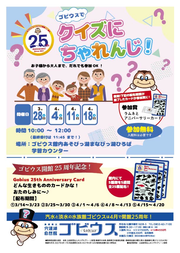 イベントチラシFlyer GWはゴビウスでなぞとき! 祝・開館25周年! ゴビウスで「クイズにちゃれんじ」 お子様から大人まで、だれでも参加OK! 年間パスポートイベント「Welcom!Gobius」新1年生のみなさんを対象 ゴビウスサポーター募集中!