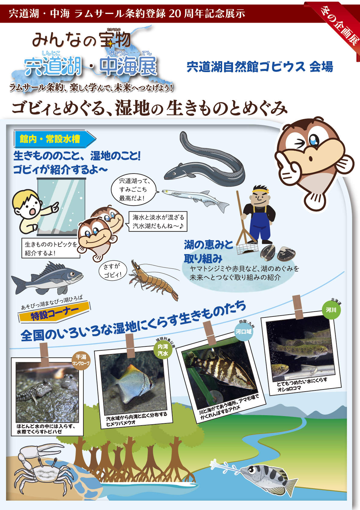 これを記念して、宍道湖自然館ゴビウスでは、館の大きなテーマのひとつである「宍道湖・中海」に改めて焦点を当て、生きもの・自然環境・人々とのつながりについてご紹介する特別展示を開催いたします。
